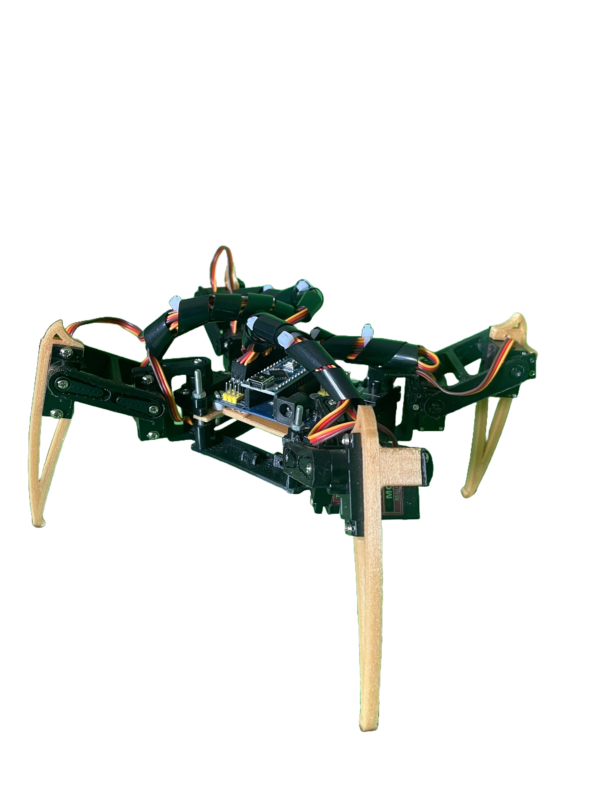 - Servo Motors (12): Twelve servos are spread across the four legs, with three per leg controlling hip, knee, and ankle movements for flexible, spider-like motion.